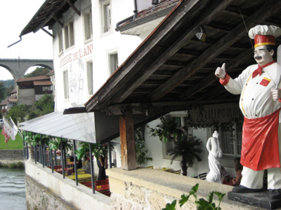 Gemischter Salat Walliser Schweinssteak mit Tomaten und Käse überbacken Pommes Frites Gemüse Dessert